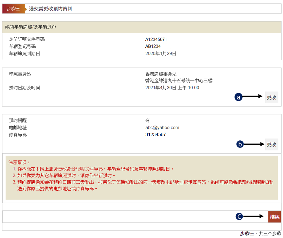 如需更改牌照事务处或预约日期及时间资料,按「更改」
