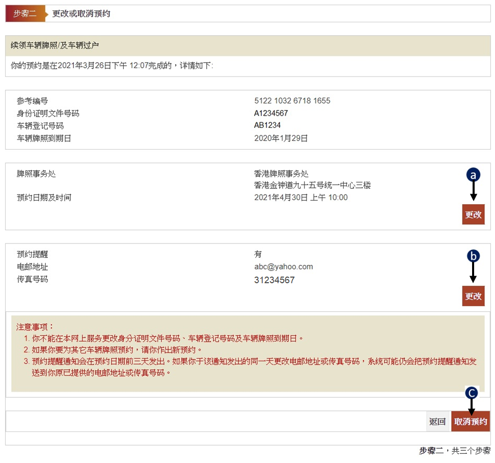 如需更改牌照事务处或预约日期及时间资料,按「更改」,然后请看下文显示。